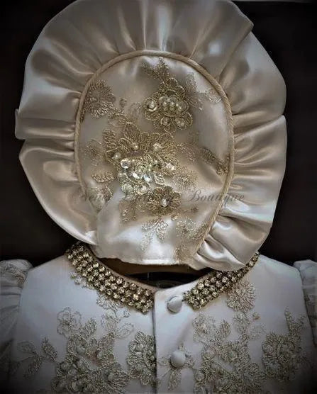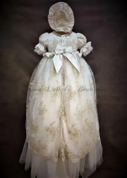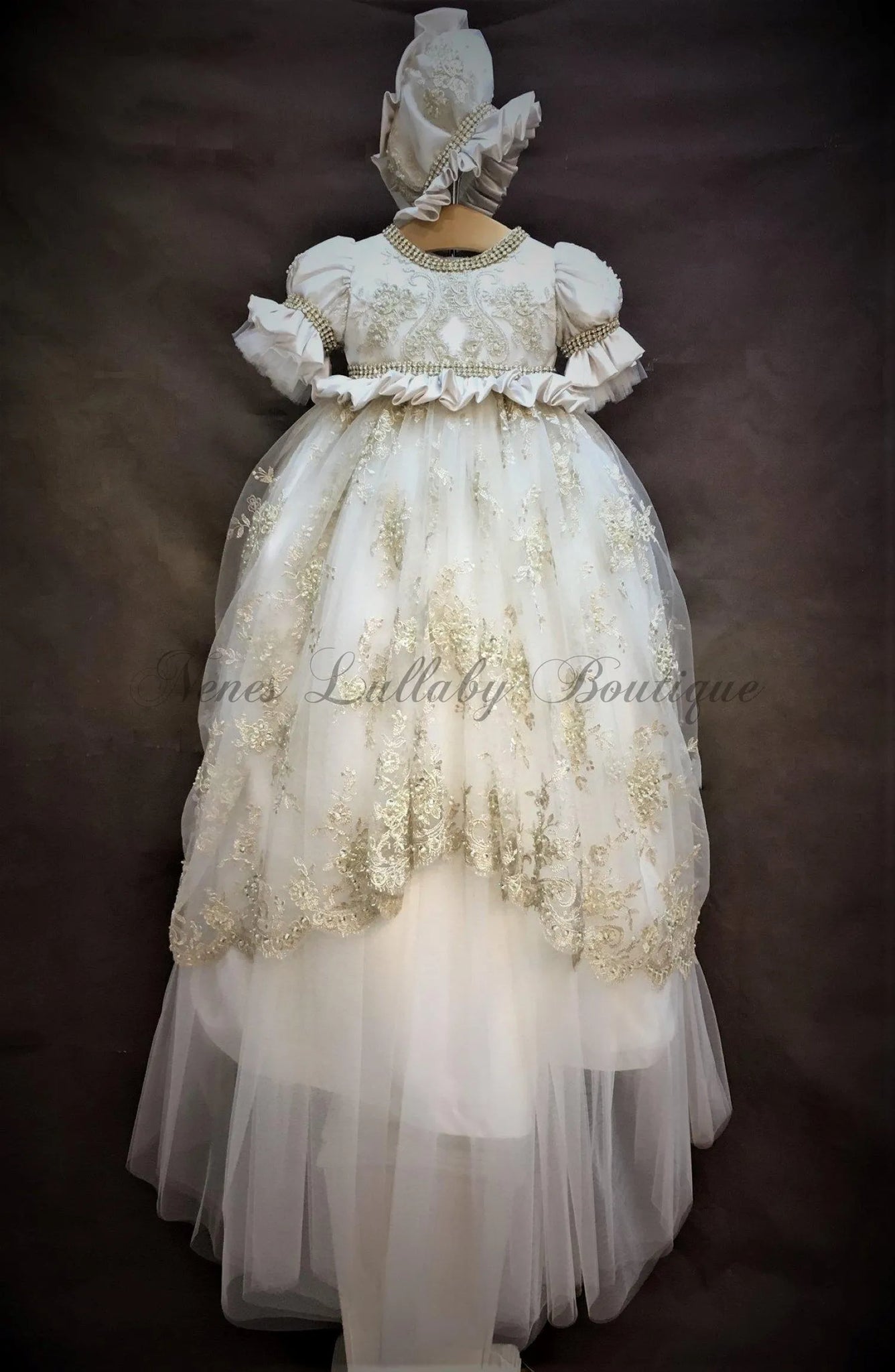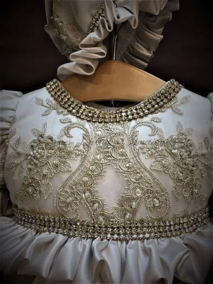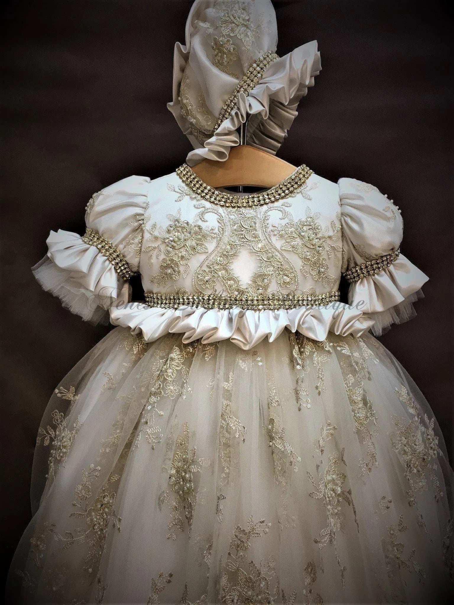 Sabrina Girls Regal Couture Champagne Laces & oyster satin accented with rhinestone at waist and pearls on lace