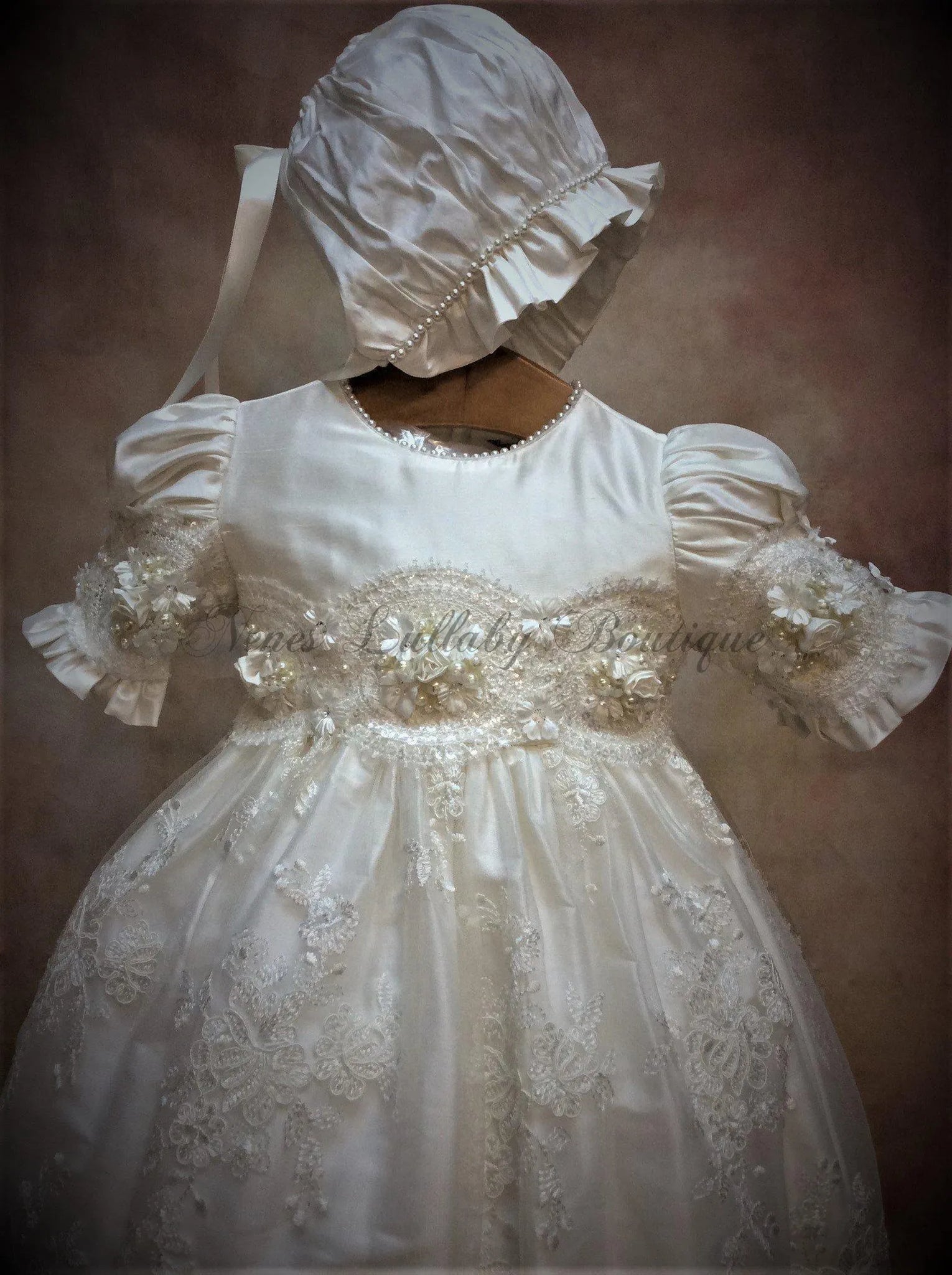 Vanessa features a white silk skirt adorned with intricately re-embroidered lace and a delicate scalloped edge. The bodice is beautifully decorated with 3D floral accents and pearls, while the softly puffed sleeves evoke a timeless Victorian charm. This elegant Christening gown includes a coordinating bonnet from Piccolo Bacio Couture, perfect for a memorable baptism day.