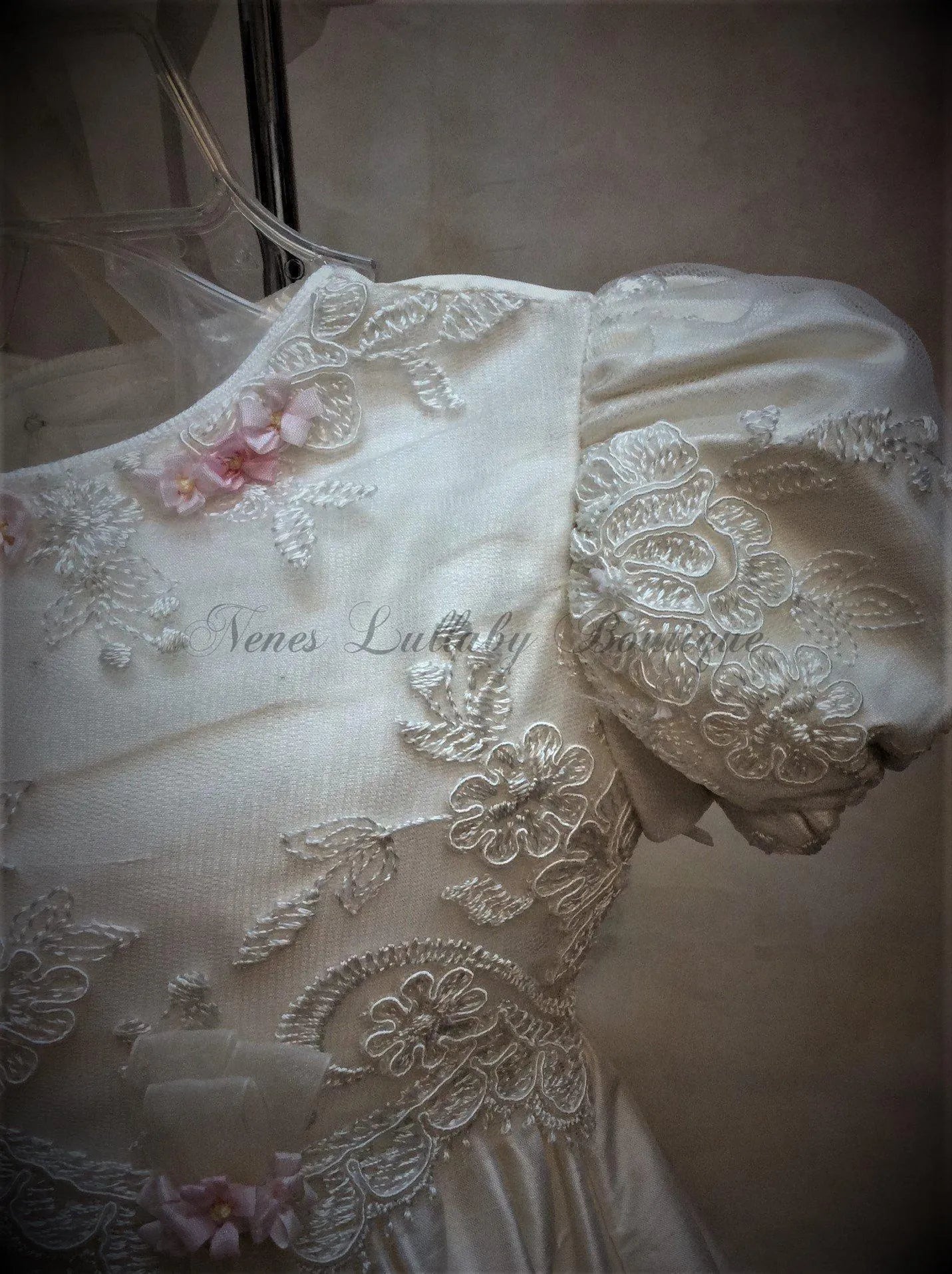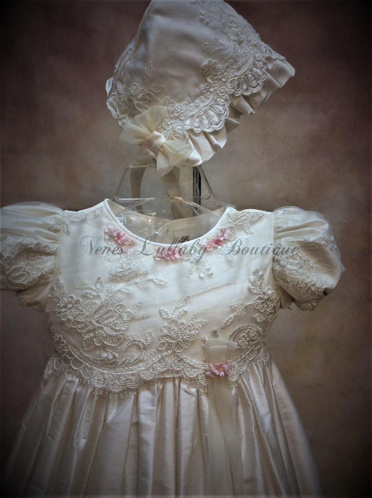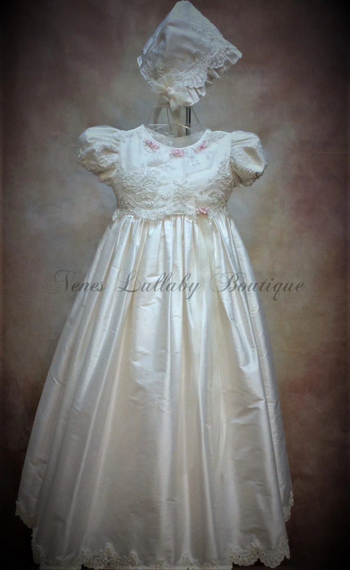 Piccolo Bacio 100% White Silk Christening Gown with lace trim & Pink rosette matching bonnet