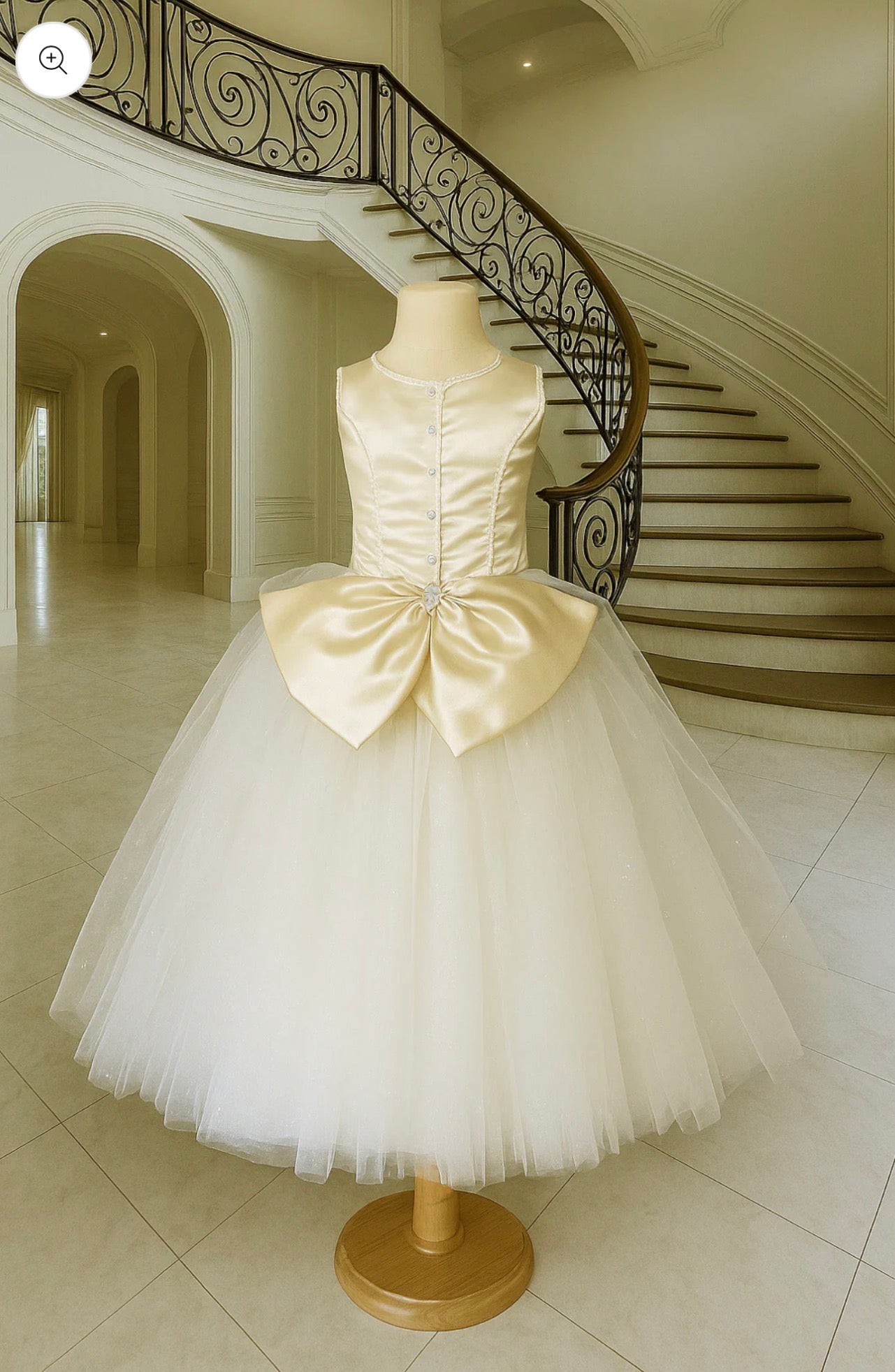 At the back, the Bristol dress stuns with a grand bow and pearl button detailing, making it picture-perfect from every angle. The structured and ethereal tulle create a balanced silhouette that is both regal and youthful—perfect for her First Holy Communion.