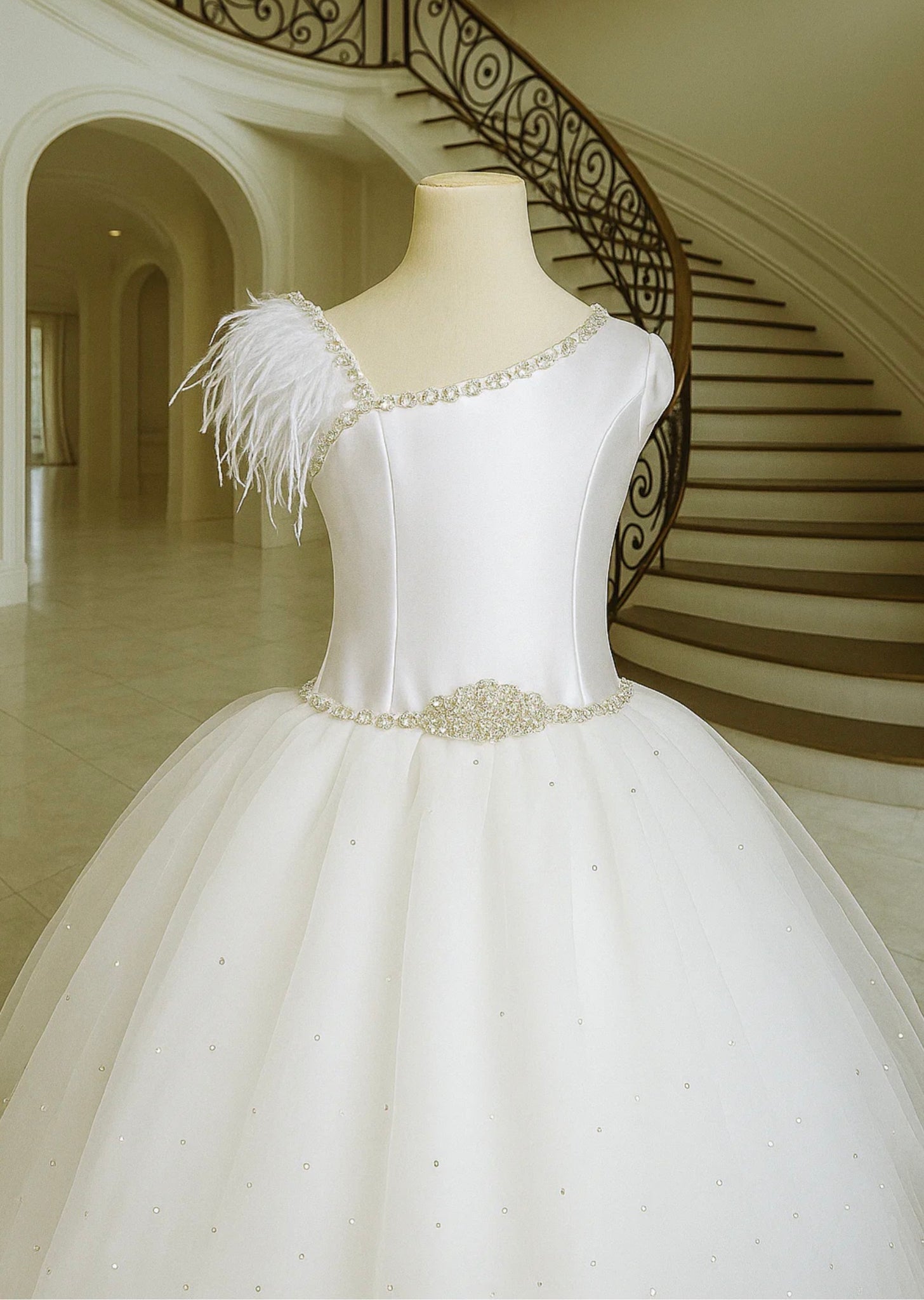 Captivate the moment with our breathtaking “Riley” One-Shoulder Communion Gown, a couture-inspired masterpiece designed for girls who deserve to shine on their special day. With its stunning feather detail, crystal embellishments, and grand silhouette, this gown is a showpiece for First Holy Communion, pageants, or milestone celebrations.