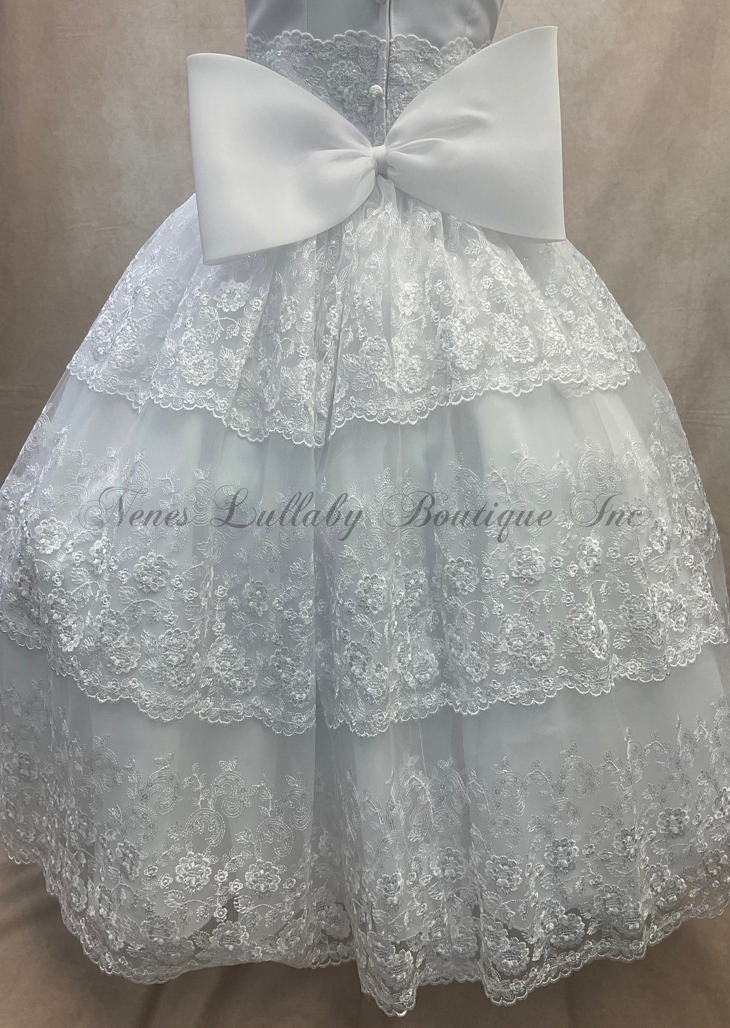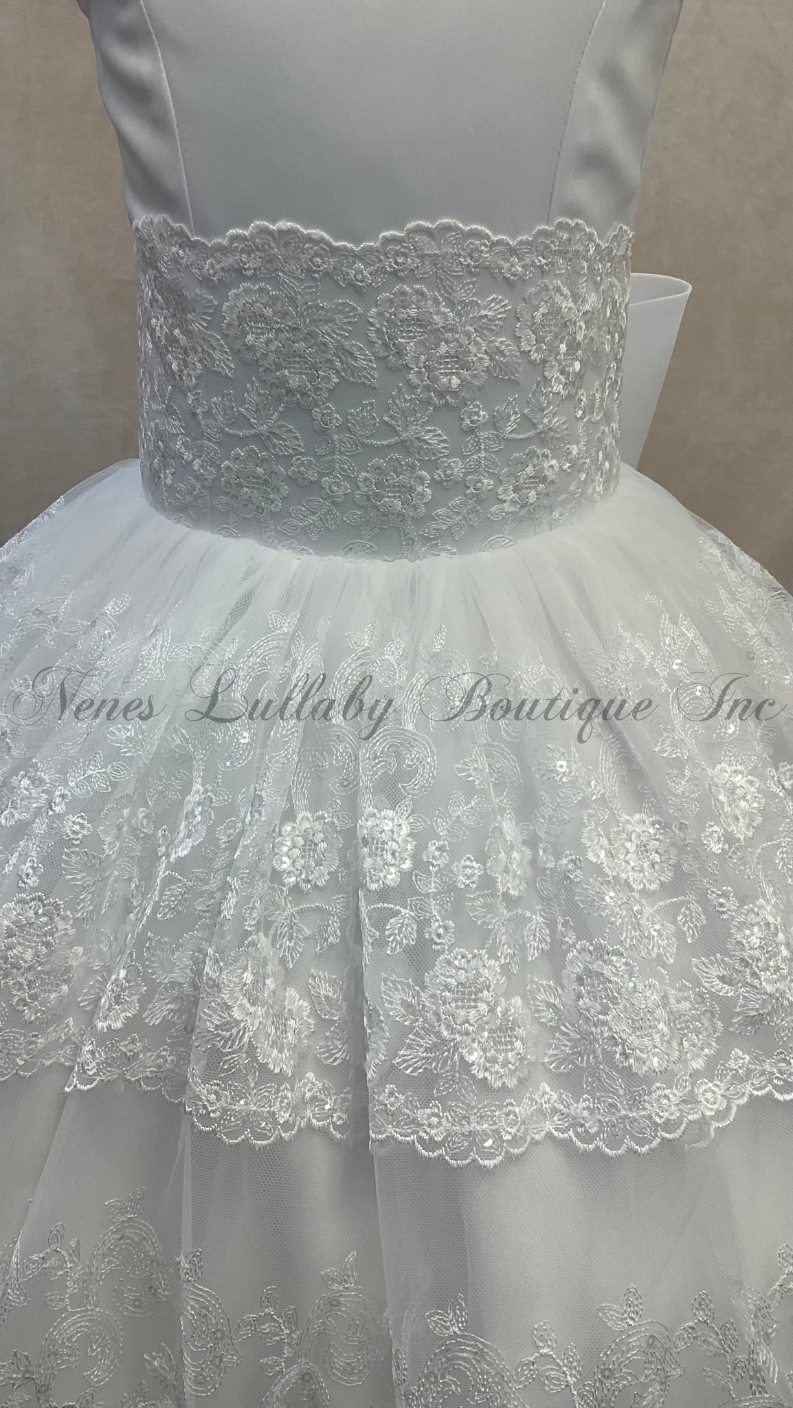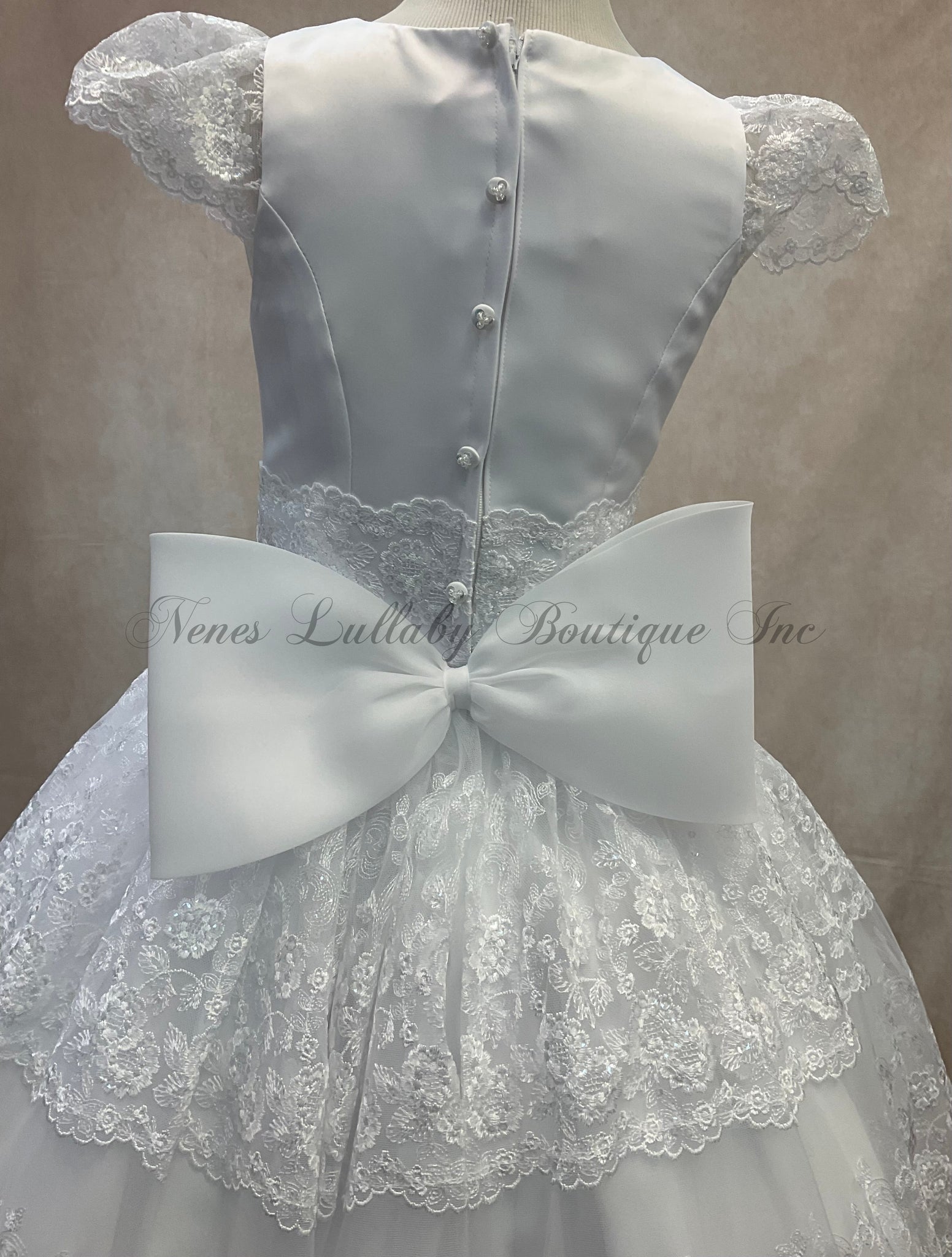 TheTaylor Communion Dress by Bella Bow is a  white couture dress featuring 3 Tier lace skirt / Lace cap sleeve