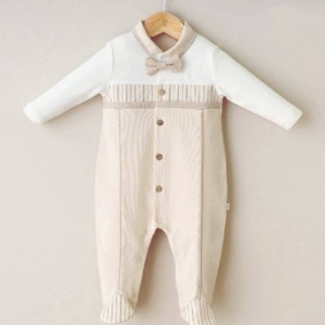 100% Cotton Elegant Style Baby Boy Striped Footed Bodysuit A Pack of Four sizes: 0-3M, 3-6M, 6-9M, 9-12M This is a very stylish bodysuit for baby boys. A comfortable and casual elegance for special occasions. With a vest and bow tie over the jumpsuit, this romper has a unique style, can be worn very comfortably. Bamboo buttoned on the front. Combines classic summer colours with stylish styling with small details. Made of 100% Cotton. Family Heirloom Baby Clothes. Gentle wash with gentle detergents in cold water. Do not tumble dry.